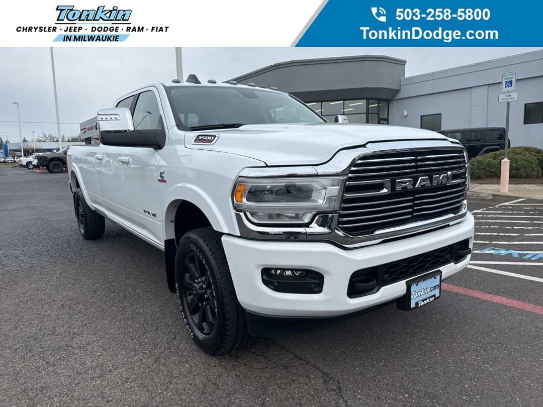 Clean CARFAX. 2024 Ram 3500 Laramie Cummins 6.7L I6 Turbodiesel 6-Speed Automatic 4WD 4D Crew Cab Bright White Clearcoat 4WD, 12" Touchscreen Display, 18" x 8" Polished Aluminum Wheels, 2nd Row In Floor Storage Bins, 4G LTE Wi-Fi Hot Spot, Alexa Built-In, Apple CarPlay, Auto Adjust In Reverse Exterior Mirrors, Auto Dimming Exterior Passenger Mirror, Auto High Beam Headlamp Control, Auto Power-Folding Mirrors, Auto-Dimming Exterior Mirrors, Auxiliary Switches Prep, Bed Utility Group, Blind Spot & Cross Path Detection, Center Hub, Chrome Exterior Mirrors, Clearance Lamps, Cold Weather Group, Connected Travel & Traffic Services, Connectivity - US/Canada, Dash Pass Thru Wire Circuits, Disassociated Touchscreen Display, Engine Block Heater, Exterior Mirrors Courtesy Lamps, Exterior Mirrors w/Heating Element, Exterior Mirrors w/Memory, Exterior Mirrors w/Supplemental Signals, Foam Bottle Insert (Door Trim Panel), For Details Visit DriveUconnect.com, For More Info, Call 800-643-2112, Forward & Reverse Utility Lights, Front LED Fog Lamps, Global Telematics Box Module (TBM), Google Android Auto, GPS Antenna Input, GPS Navigation, HD Radio, I/P Mounted Auxiliary Switches, Integrated Voice Command w/Bluetooth, Laramie Level 1 Equipment Group, LED Bed Lighting, LED Reflector Headlamps, LED Tail Lamps, Mirror Running Lights, MOPAR Deployable Bed Step, MOPAR Spray In Bedliner, MOPAR Winter Front Grille Cover, Off-Road Information Pages, ParkSense Front/Rear Park Assist System, Power Adjust Mirrors, Power Adjustable Pedals w/Memory, Power Heat Fold Memory Telescopic Mirrors, Power Telescoping Mirrors, Power-Adjustable Convex Aux Mirrors, Protection Group, Quick Order Package 2HH Laramie, Radio: Uconnect 5 Nav w/12.0" Display, Rain Sensitive Windshield Wipers, Rear Power Sliding Window, Rear Window Defroster, Remote Tailgate Release, Selectable Tire Fill Alert, SiriusXM Radio Service, SiriusXM w/360L, Snow Chief Group, Trailer Tow Pages, 10 Speakers, 115V Auxiliary Rear Power Outlet, 2 Way Rear Headrest Seat, 220 Amp Alternator, 3.73 Axle Ratio, 4 Way Front Headrests, 4-Wheel Disc Brakes, 50 Gallon Fuel Tank, 5th Wheel/Gooseneck Towing Prep Group, 8.4" Touchscreen Display, ABS brakes, Active Noise Control System, Adaptive Steering System, Air Conditioning, AM/FM radio: SiriusXM with 360L, Apple CarPlay/Android Auto, Auto-dimming Rear-View mirror, Automatic temperature control, Brake assist, Bumpers: body-color, Compass, CTR Stop Lamp w/Cargo View Camera, Custom Fuel Wheels and Off-Road Tires, Delay-off headlights, Driver door bin, Driver vanity mirror, Dual Alternators Rated At 440 Amps, Dual front impact airbags, Dual front side impact airbags, Electronic Stability Control, Electronically Controlled Throttle, Folding Flat Load Floor Storage, Front anti-roll bar, Front Center Armrest w/Storage, Front dual zone A/C, Front License Plate Bracket, Front reading lights, Front Seat Back Map Pockets, Fully automatic headlights, Garage door transmitter, Heated door mirrors, Heated Front Seats, Heated front seats, Heated Steering Wheel, Heated steering wheel, High Back Seats, Illuminated entry, Integrated Center Stack Radio, Leather steering wheel, Leather Trim 40/20/40 Bench Seat, Low tire pressure warning, MOPAR Front & Rear Rubber Floor Mats, Navigation System, Occupant sensing airbag, Outside temperature display, Overhead airbag, Overhead console, Panic alarm, ParkView Rear Back-Up Camera, Passenger door bin, Passenger vanity mirror, Power 8-Way Adjustable Passenger Seat, Power Adjust 8-Way Driver Seat, Power door mirrors, Power driver seat, Power passenger seat, Power steering, Power windows, Radio data system, Radio: Uconnect 5 Nav w/8.4" Display, Rear 60/40 Folding Seat, Rear reading lights, Rear seat center armrest, Rear step bumper, Remote keyless entry, Security system, Speed control, Split folding rear seat, Steering wheel mounted audio controls, Tachometer, Tilt steering wheel, Tip Start, Traction control, Trip computer, Turn signal indica